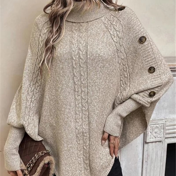 Suéter trenzado con camisa de murciélago decorada con botones de cuello alto de Europa, América, Otoño e Invierno