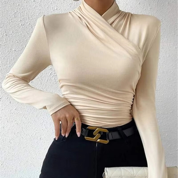 Europa y los Estados Unidos Color sólido Slim Bottoming Shirt Joker Plisado Diseño Sense Camiseta de manga larga Top de mujer